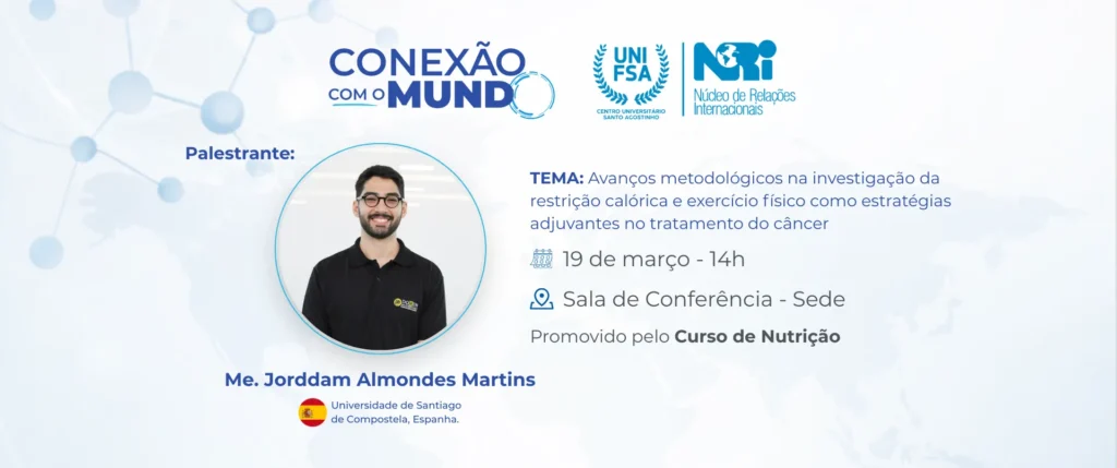 O Centro Universitário Santo Agostinho (UNIFSA) realiza, no dia 19 de março, às 14h, mais uma edição do projeto “Conexão com o Mundo”, que acontecerá em formato híbrido, com participação presencial na Sala de Conferência da SEDE. Nesta edição, a atividade será promovida em parceria com o curso de Nutrição e trará como tema “Avanços metodológicos na investigação da restrição calórica e exercício físico como estratégias adjuvantes no tratamento do câncer”.