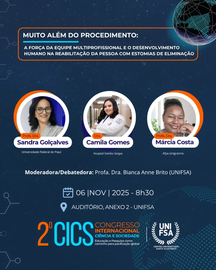 A manhã começa às 8h30, com dois painéis simultâneos. No Auditório Clóvis Melo (Anexo 2), o tema “Muito além do procedimento: a força da equipe multiprofissional e o desenvolvimento humano na reabilitação da pessoa com estomias de eliminação” abre os trabalhos, reunindo Profa. Dra. Sandra Marina Gonçalves Bezerra (UESPI), Dra. Camila Gomes (Hospital Getúlio Vargas) e Profa. Dra. Márcia Regina Costa (Afya-Unigranrio, em participação remota). A moderação é da Profa. Dra. Bianca Anne Mendes de Brito, do UNIFSA.