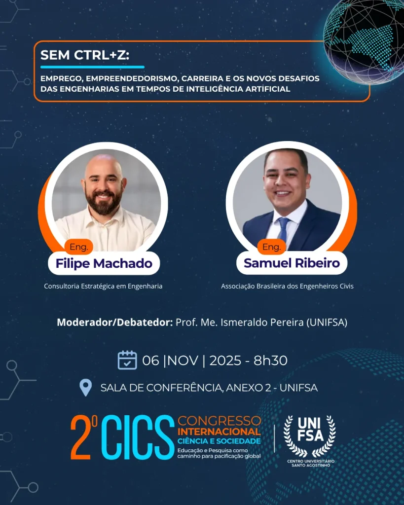 Ao mesmo tempo, na Sala de Conferência, ocorre a mesa “Sem Ctrl+Z: emprego, empreendedorismo, carreira e os novos desafios das engenharias em tempos de inteligência artificial”, com os engenheiros Filipe Machado e Samuel Ribeiro, sob moderação do Prof. Me. Ismeraldo Pereira de Oliveira (UNIFSA).