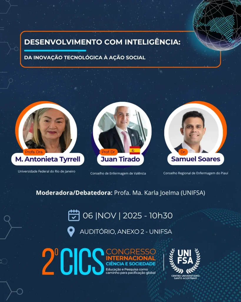 No Auditório Clóvis Melo, o tema “Desenvolvimento com inteligência: da inovação tecnológica à ação social” trará contribuições da Profa. Dra. Maria Antonieta Rubio Tyrrell (UFRJ), do Prof. Dr. Juan José Tirado (Conselho de Enfermagem da Comunidade de Valência, Espanha, em participação remota), e do Dr. Samuel Soares (Conselho Regional de Enfermagem do Piauí), com mediação da Profa. Ma. Karla Joelma Bezerra Cunha (UNIFSA).