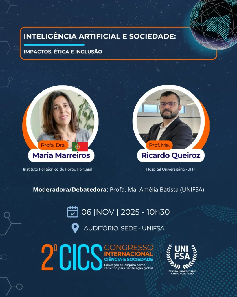 Já na Sede do UNIFSA, o Auditório Manoel Cipriano Lira recebe o debate “Inteligência artificial e sociedade: impactos, ética e inclusão”, com Profa. Dra. Maria Goreti Carvalho Marreiros (Instituto Politécnico do Porto, Portugal) e Prof. Me. Ricardo Gomes de Queiroz (HU-UFPI), sob moderação da Profa. Ma. Amélia Acácia de Miranda Batista (UNIFSA).