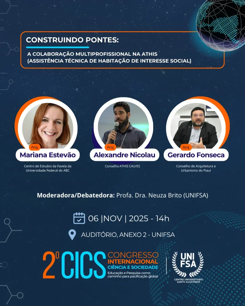 Logo em seguida, às 14h, dois painéis acontecem em paralelo. No Auditório Clóvis Melo, a mesa “Construindo pontes: a colaboração multiprofissional na ATHIS (Assistência Técnica de Habitação de Interesse Social)” reunirá Arq. Mariana Estevão (UFABC/Quanta Consultoria), Arq. Alexandre Ricardo Nicolau (CAU/ES) e Arq. Gerardo Fonseca (CAU/PI), com moderação da Profa. Dra. Neuza Brito de Arêa Leão Melo (UNIFSA).