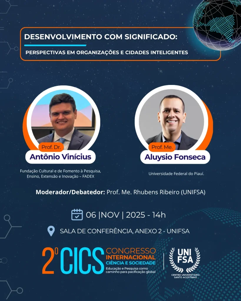 Simultaneamente, na Sala de Conferência, será debatido o tema “Desenvolvimento com significado: perspectivas em organizações e cidades inteligentes”, com Prof. Dr. Antonio Vinicius Oliveira Ferreira (FADEX) e Prof. Me. Aluysio Ricardo Nunes Fonseca (UFPI), sob mediação do Prof. Me. Rhubens Ewald Moura Ribeiro (UNIFSA).
