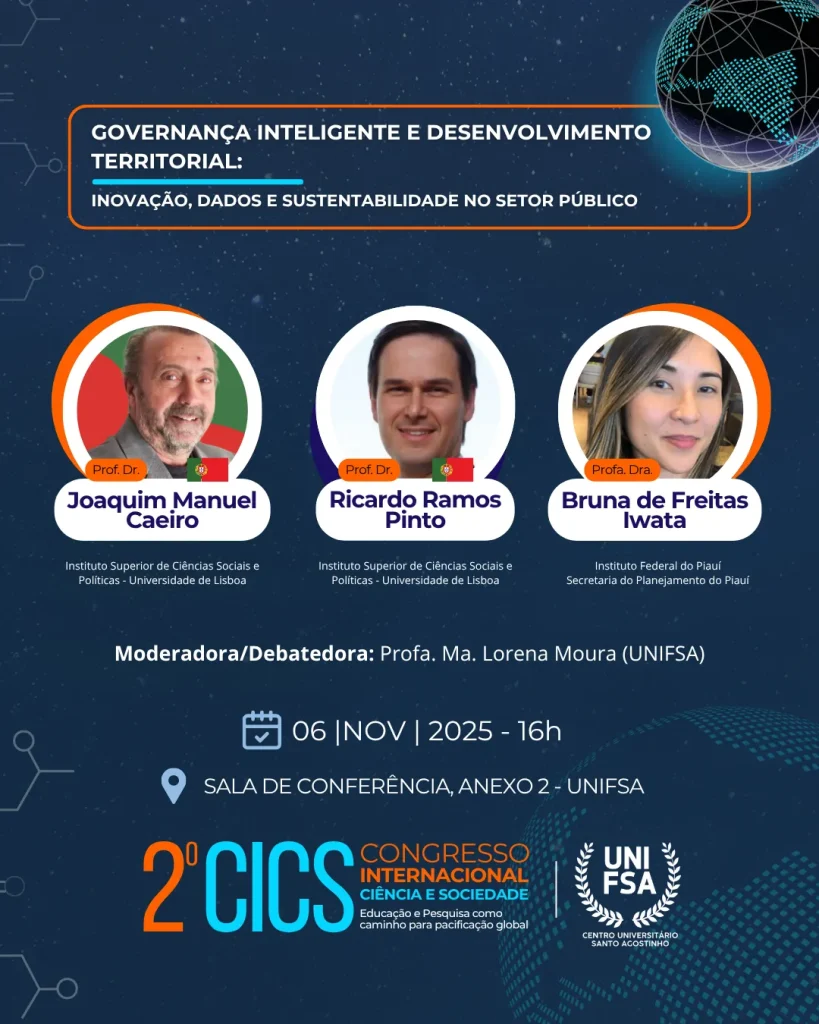 Encerrando a tarde, às 16h, o CICS traz discussões que unem política, sustentabilidade e protagonismo social. Na Sala de Conferência, o painel “Governança inteligente e desenvolvimento territorial: inovação, dados e sustentabilidade no setor público” contará com os professores Dr. Joaquim Manuel Croca Caeiro, Dr. Ricardo Ramos Pinto (ambos da Universidade de Lisboa) e Profa. Dra. Bruna de Freitas Iwata (IFPI/SEPLAN-PI), com mediação da Profa. Ma. Lorena Moura Santana (UNIFSA).