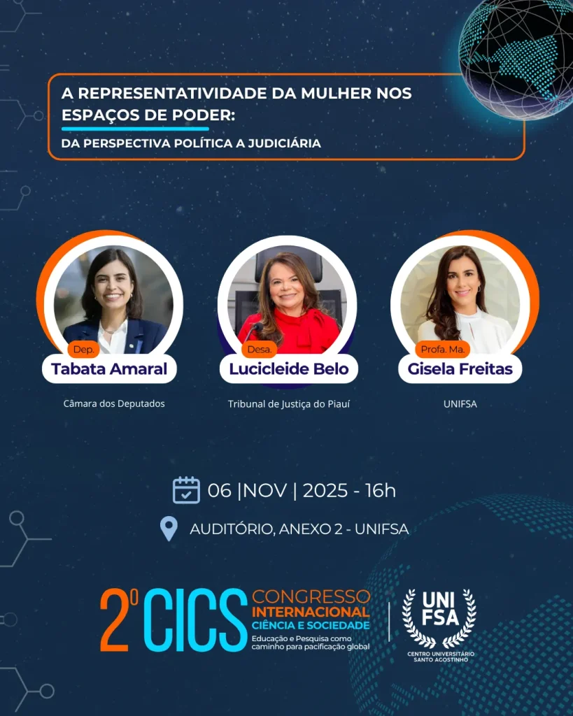 Enquanto isso, no Auditório Clóvis Melo, acontece a mesa “A representatividade da mulher nos espaços de poder: da perspectiva política à judiciária”, com a participação da Dep. Tabata Amaral (PSB-SP) e da Desa. Lucicleide Pereira Belo (TJ-PI), em debate mediado pela Profa. Ma. Gisela Carvalho de Freitas (UNIFSA).