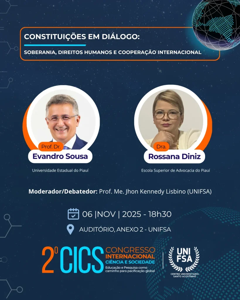À noite, as discussões seguem com mais dois importantes encontros. No Auditório Clóvis Melo, o tema “Constituições em diálogo: soberania, direitos humanos e cooperação internacional” reúne Prof. Dr. Evandro Alberto de Sousa (UESPI) e Dra. Rossana Diniz (ESA/OAB-PI), com debate conduzido pelo Prof. Me. Jhon Kennedy Teixeira Lisbino (UNIFSA).