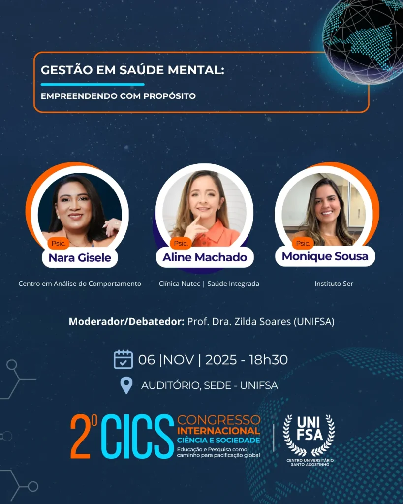 Simultaneamente, no Auditório Manoel Cipriano Lira, o painel “Gestão em saúde mental: empreendendo com propósito” encerra o dia com reflexões sobre inovação e cuidado na psicologia. O encontro conta com as psicólogas Nara Gisele de Araújo, Aline Maria Machado de Sousa e Monique Helen Alves de Melo e Souza, sob mediação da Profa. Dra. Maria Zilda Silva Soares (UNIFSA).