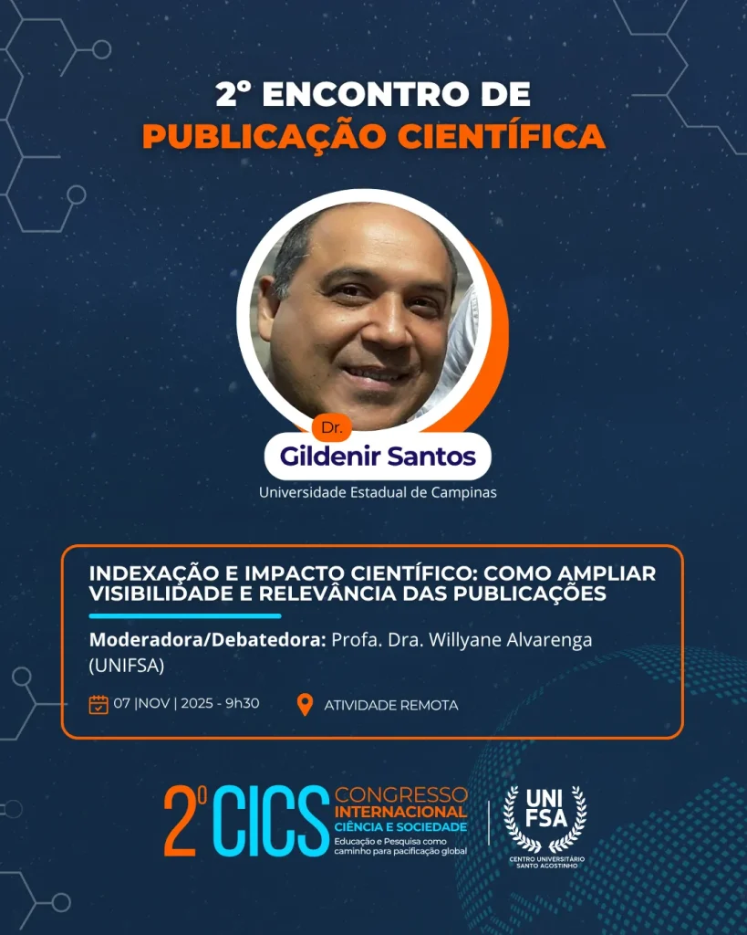 Na sequência, o Dr. Gildenir Carolino Santos (Universidade Estadual de Campinas) ministra a conferência “Indexação e impacto científico: como ampliar visibilidade e relevância das publicações”, com moderação da Profa. Dra. Willyane de Andrade Alvarenga (UNIFSA). O tema destaca estratégias para fortalecer a presença de periódicos e artigos acadêmicos em bases internacionais, ampliando o alcance da produção científica brasileira.