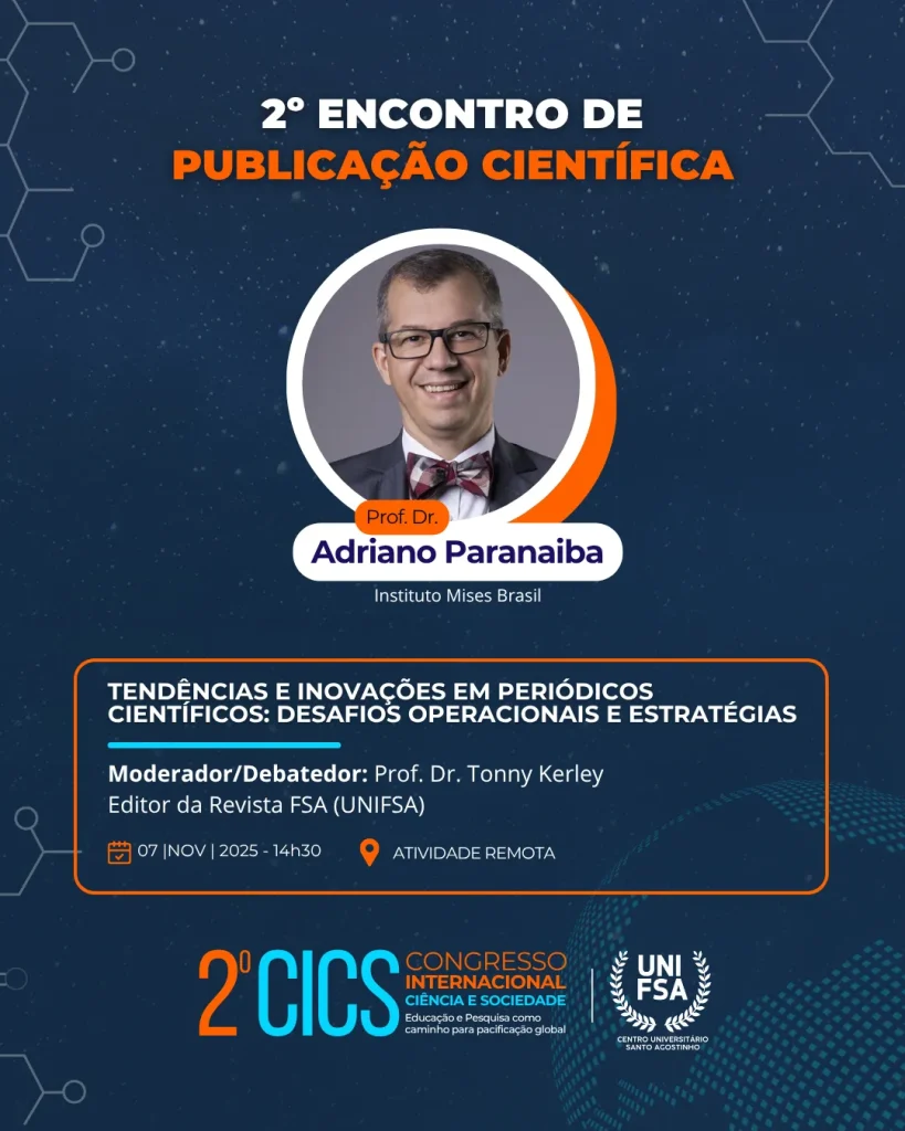 No turno da tarde, os debates retomam às 14h30 com a palestra “Tendências e inovações em periódicos científicos: desafios operacionais e estratégias”, apresentada pelo Prof. Dr. Adriano de Carvalho Paranaiba (Instituto Mises Brasil), e mediada pelo Prof. Dr. Tonny Kerley de Alencar Rodrigues, editor da Revista FSA (UNIFSA). A conversa abordará as transformações recentes no campo editorial e os caminhos para tornar os periódicos mais atrativos, dinâmicos e eficientes.