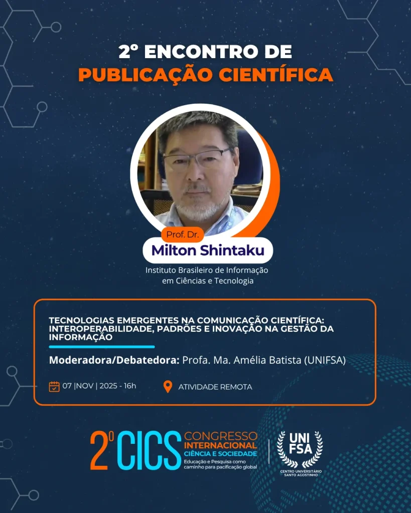 Encerrando o evento, às 16h, o Dr. Milton Shintaku (Instituto Brasileiro de Informação em Ciência e Tecnologia – IBICT) ministra a conferência “Tecnologias emergentes na comunicação científica: interoperabilidade, padrões e inovação na gestão da informação”, com moderação da Profa. Ma. Amélia Acácia de Miranda Batista (UNIFSA). O painel discutirá o impacto das novas tecnologias na forma de produzir, gerenciar e disseminar o conhecimento científico.