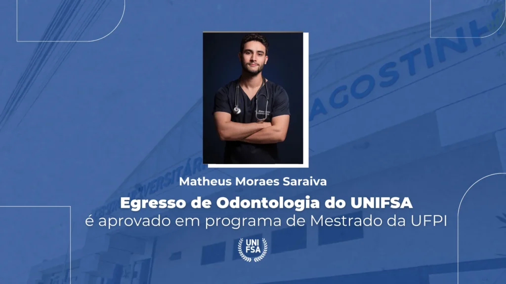 O Centro Universitário Santo Agostinho (UNIFSA) celebra mais uma conquista acadêmica de seus egressos. O recém-formado em Odontologia Matheus Moraes Saraiva foi aprovado no programa de Mestrado Acadêmico em Odontologia da Universidade Federal do Piauí (UFPI), na linha de pesquisa em Biociências e Materiais Odontológicos. Além disso, também foi aprovado na Residência Multiprofissional em Saúde da Família – Odontologia da Fundação Escola de Saúde Pública do Piauí (FESP-PI).