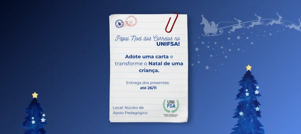 O Centro Universitário Santo Agostinho está participando do Projeto Papai Noel dos Correios, uma iniciativa que leva alegria e esperança para crianças de escolas públicas de Teresina, realizando seus desejos através de doações. A instituição convida todos os seus alunos, docentes e colaboradores a se tornarem “padrinhos” e “madrinhas” dessas crianças, adotando cartinhas com pedidos ao Papai Noel e ajudando a transformar sonhos em realidade.