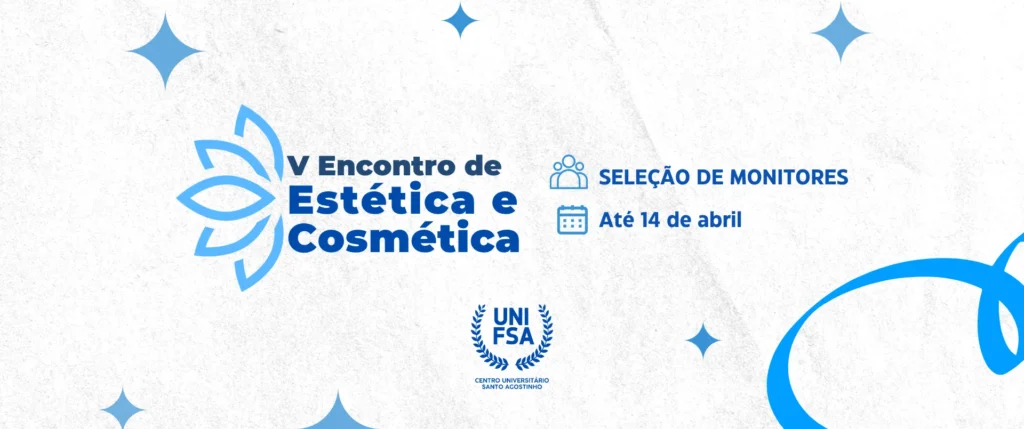 O Centro Universitário Santo Agostinho, por meio do curso de Estética e Cosmética presencial e semipresencial, seleciona alunos monitores para o V Encontro de Estética e Cosmética, evento que acontecerá . O prazo vai até o dia 14 de abril, com o custo de 1kg de arroz ou feijão (entregar no NUAPE após a inscrição realizada). Os candidatos pré-selecionados passarão por uma entrevista, no dia 15 de abril, às 15h, na Sala 112 – Anexo II, a fim de se analisar as habilidades atitudinais necessárias à proposta da extensão.