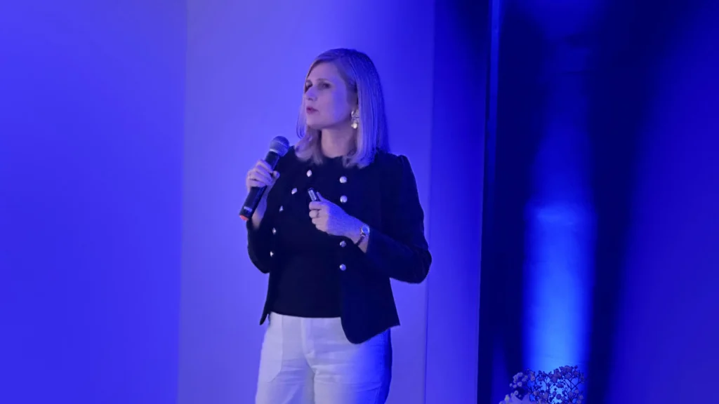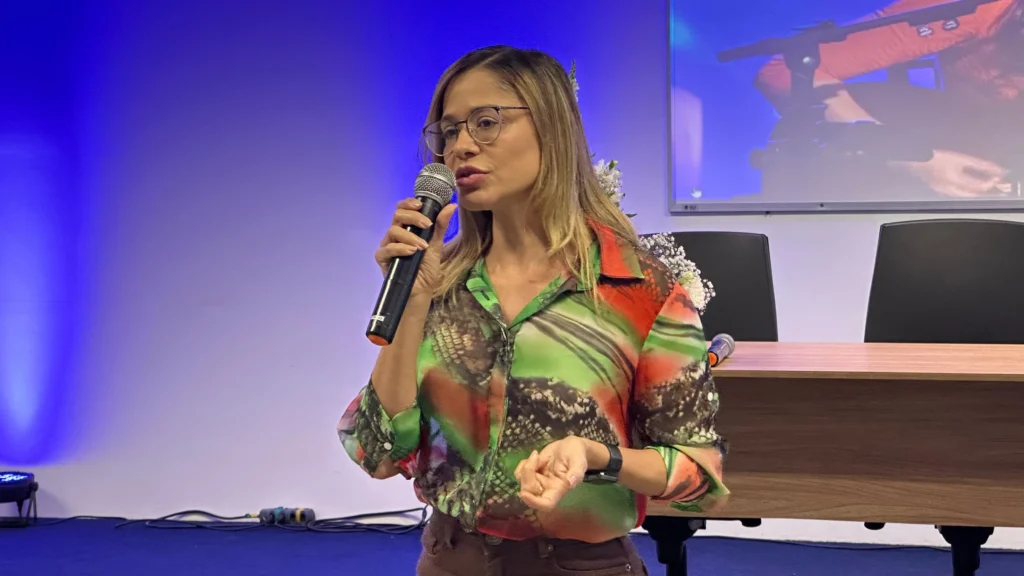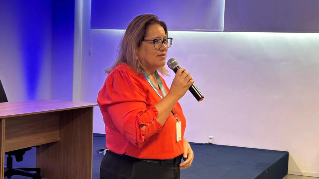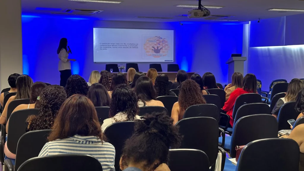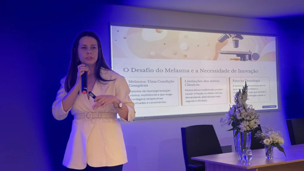 Na sequência, a farmacêutica Marianne Lira apresentou uma explanação científica sobre o melasma, destacando mecanismos de ação e ativos clareadores.