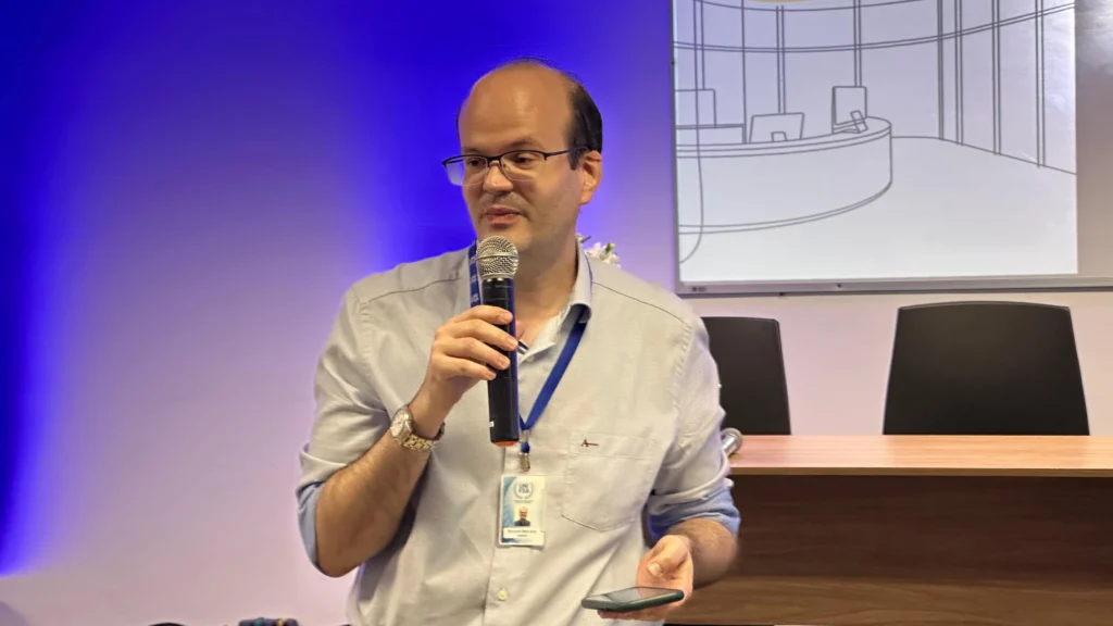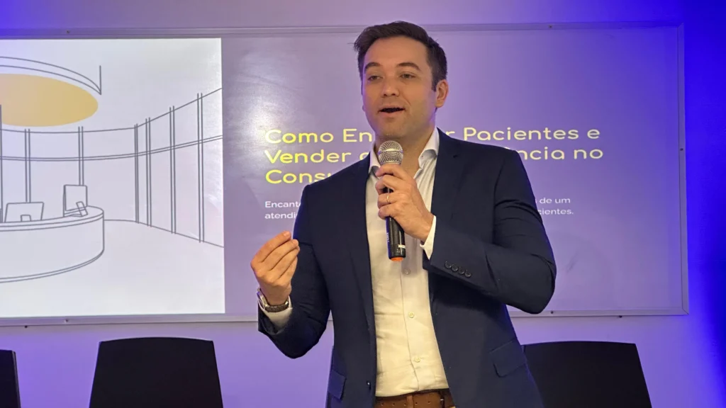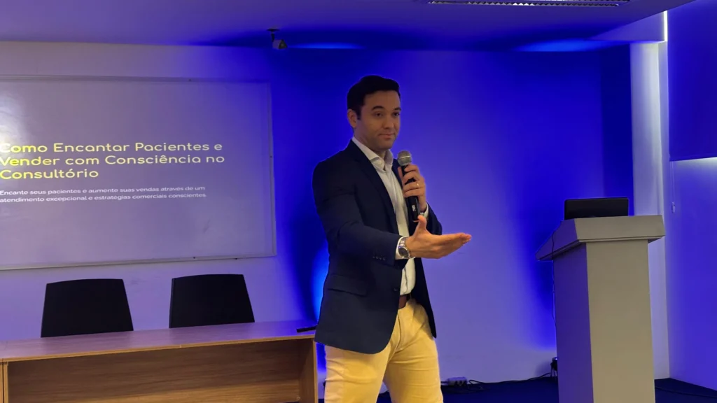 Logo em seguida, os participantes acompanharam a palestra de Carlos Eduardo Barros, que abordou estratégias de relacionamento e encantamento para melhorar o atendimento ao paciente.