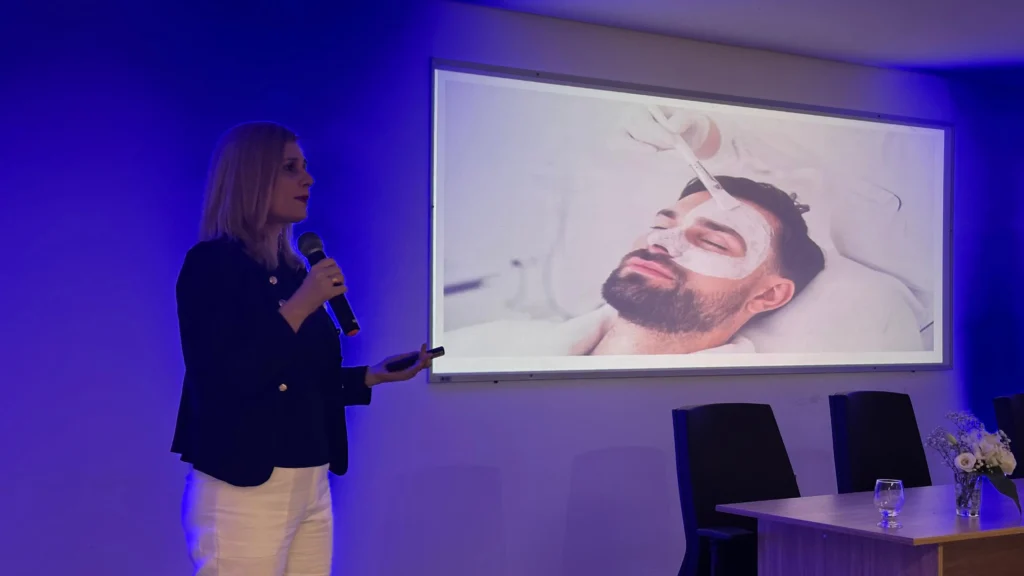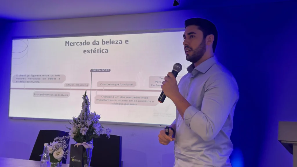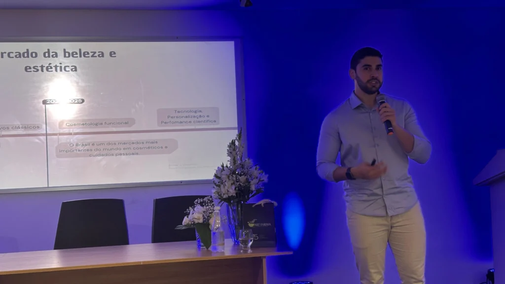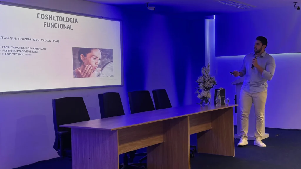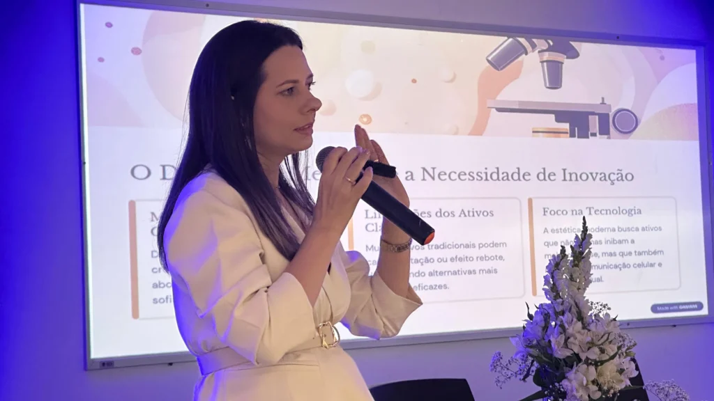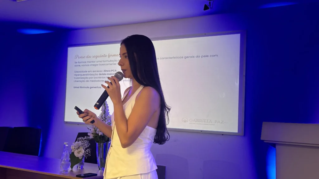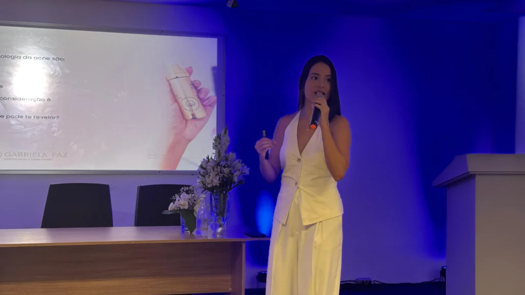 Durante a tarde, Gabriela Paz conduziu a palestra “Da fórmula ao resultado”, explicando processos de prescrição cosmética e sua aplicação prática.
