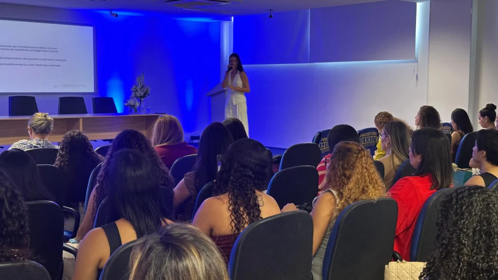 Durante a tarde, Gabriela Paz conduziu a palestra “Da fórmula ao resultado”, explicando processos de prescrição cosmética e sua aplicação prática.
