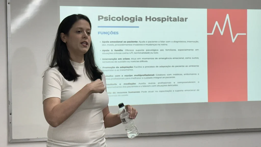 A mesa-redonda “Psicologia Hospitalar: Desafios, Práticas e Humanização do Cuidado” contou com as participações da Esp. Marília Aguiar (egressa UNIFSA) e da psicóloga Talyta Campelo (Hospital do Mocambinho). As convidadas compartilharam experiências do cotidiano hospitalar, destacando o papel essencial da Psicologia no cuidado humanizado e na escuta empática aos pacientes e familiares.
