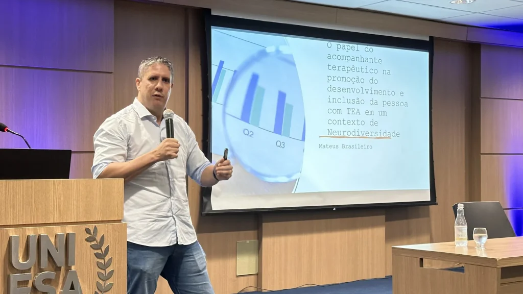 Logo após a abertura, o Dr. Mateus Brasileiro Pereira (PUC-SP) ministrou a palestra magna com o tema “Neurodiversidade em foco: caminhos para inclusão”, abordando a importância de reconhecer e respeitar as diferenças neurológicas como parte da diversidade humana. A fala despertou grande interesse entre os participantes, promovendo uma discussão necessária sobre inclusão e acessibilidade na prática psicológica.